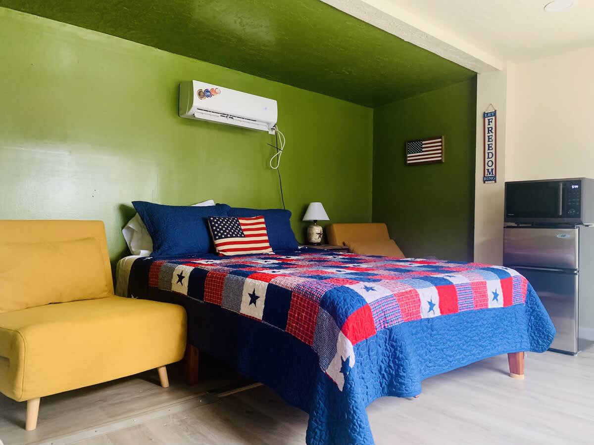 Warriors Way — A wheelchair accessible tiny house in Medicine Park honoring our military heroes. Sleeps 2–4 with queen bed + 2 twin chairs, kitchenette, WiFi, Smart TV. Relax on a private patio or at the gazebo. Walk to Bath Lake for swimming, enjoy shops like the White Buffalo, and music at Park Tavern. Explore nearby Wichita Mountains trails like Elk Mountain & Baldy Point, plus local Casinos or the Holy City. Ideal for graduations or history lovers. Additional guests after 2 are extra $.