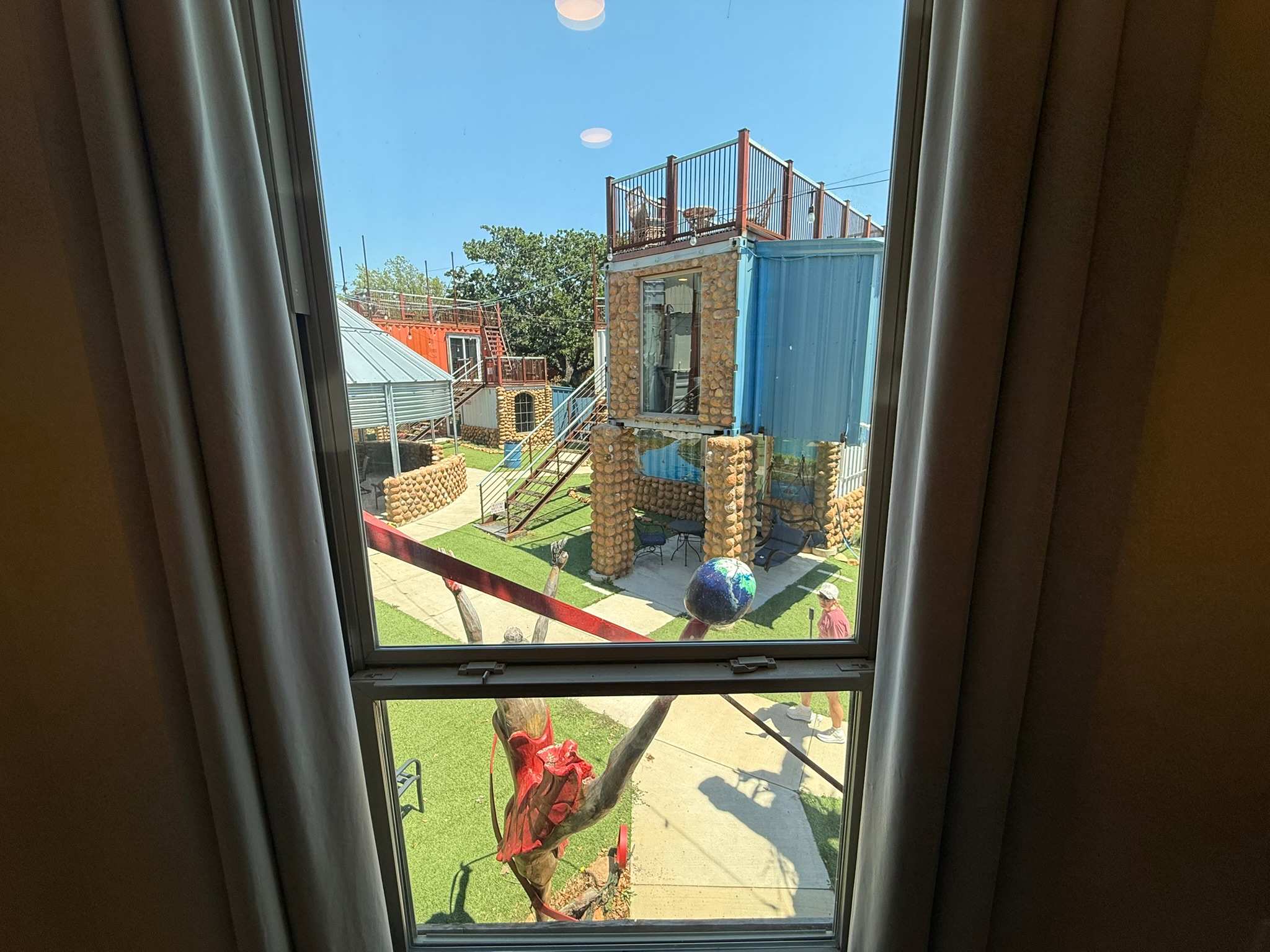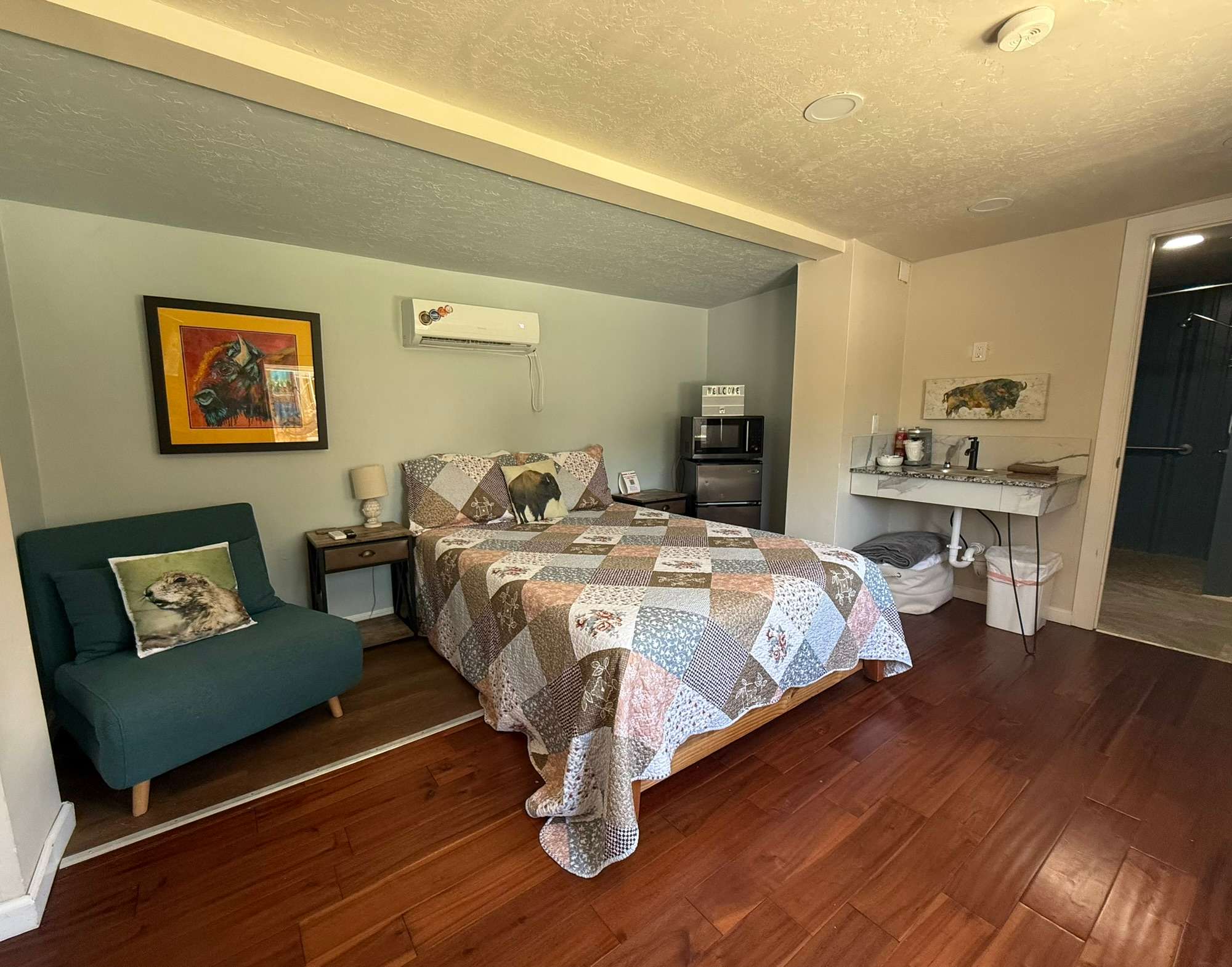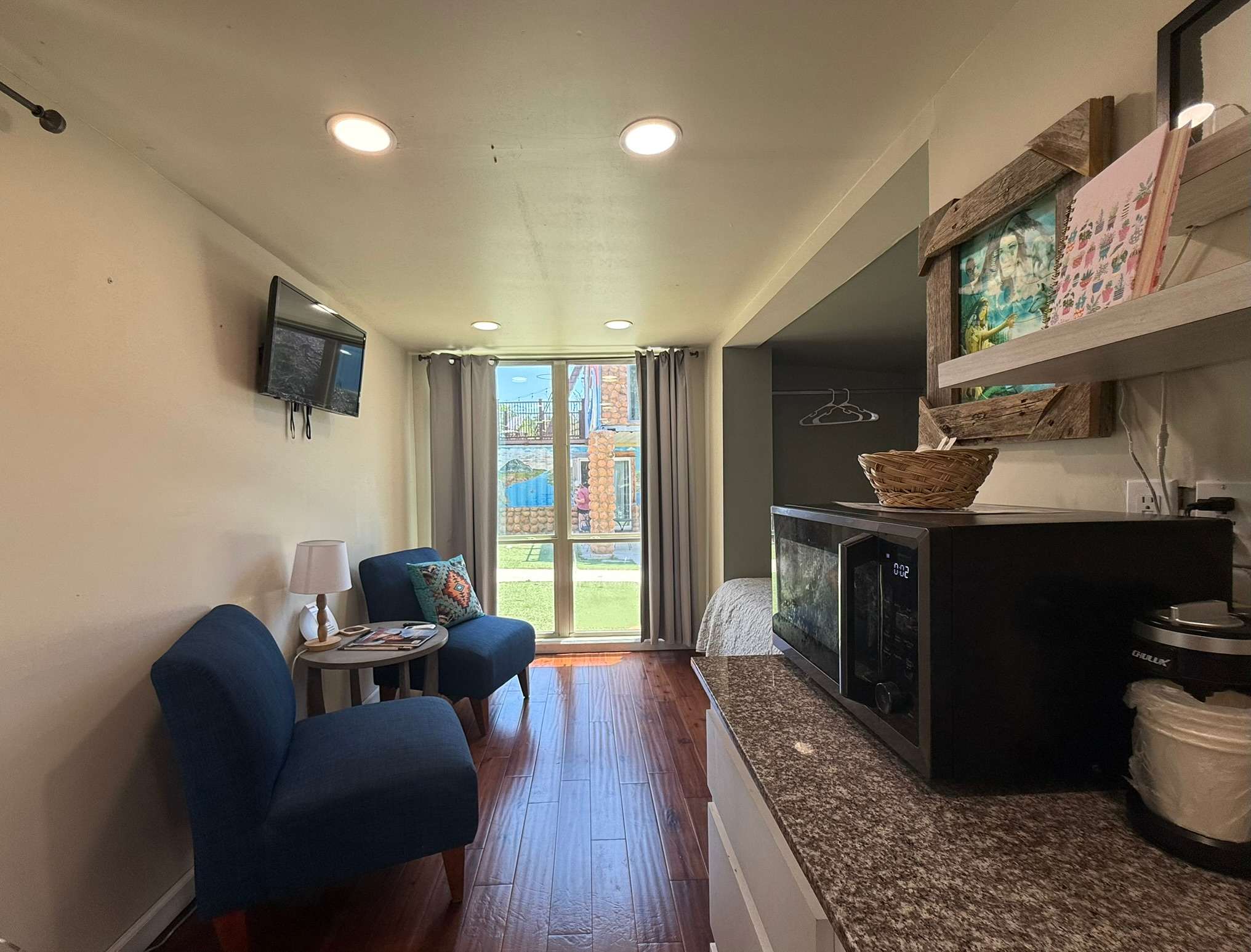 Modern tiny-home resort in the heart of Medicine Park. Each themed unit offers a queen bed plus extra sleep space, walk-in shower, kitchenette, fast WiFi, Smart TV, and either a private porch or rooftop deck. Steps to shops, dining, Medicine Creek, and live music. Access to Refuge Ale House, Little Bear Street Eats, fire pits, and the Grainery Gazebo. Extra guest and pet fees apply.