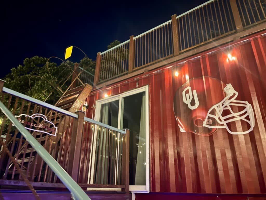 Guests that reserve Sooner Escape will have their own second-floor landing deck with a bistro set, as well as an entire rooftop deck with additional seating. They also have access to the common gazebo and the grounds.