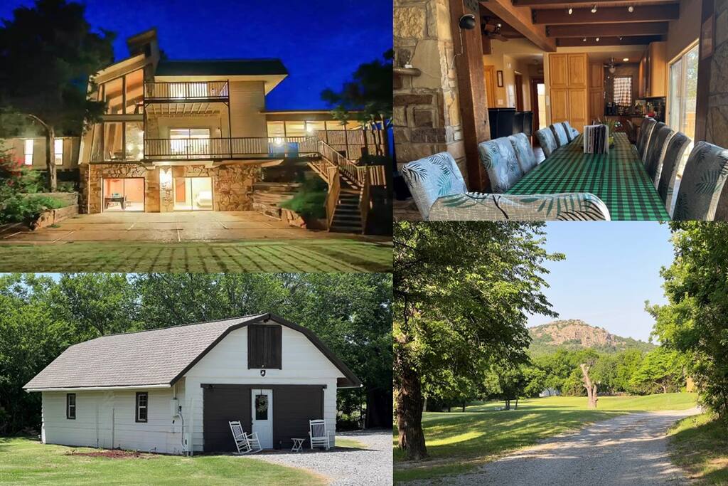 Group Getaway (Reunions / Friends) - Plan your group getaway at this 9-acre lodge + barn + airstream with pool, 3 hot tubs, 3 kitchens, 6.5 baths, and 3 fireplaces. Sleeps 35 with 8 bedrooms and 23 beds, including 6 kings. Enjoy patios, balconies, billiards, darts, games, grill, and a 65" smart TV. outdoor seating for 28. Just 5 mins to Fort Sill, Medicine Park, and the Refuge. Perfect for reunions, celebrations, and retreats. Pet friendly with fee. Extra guest fees apply.